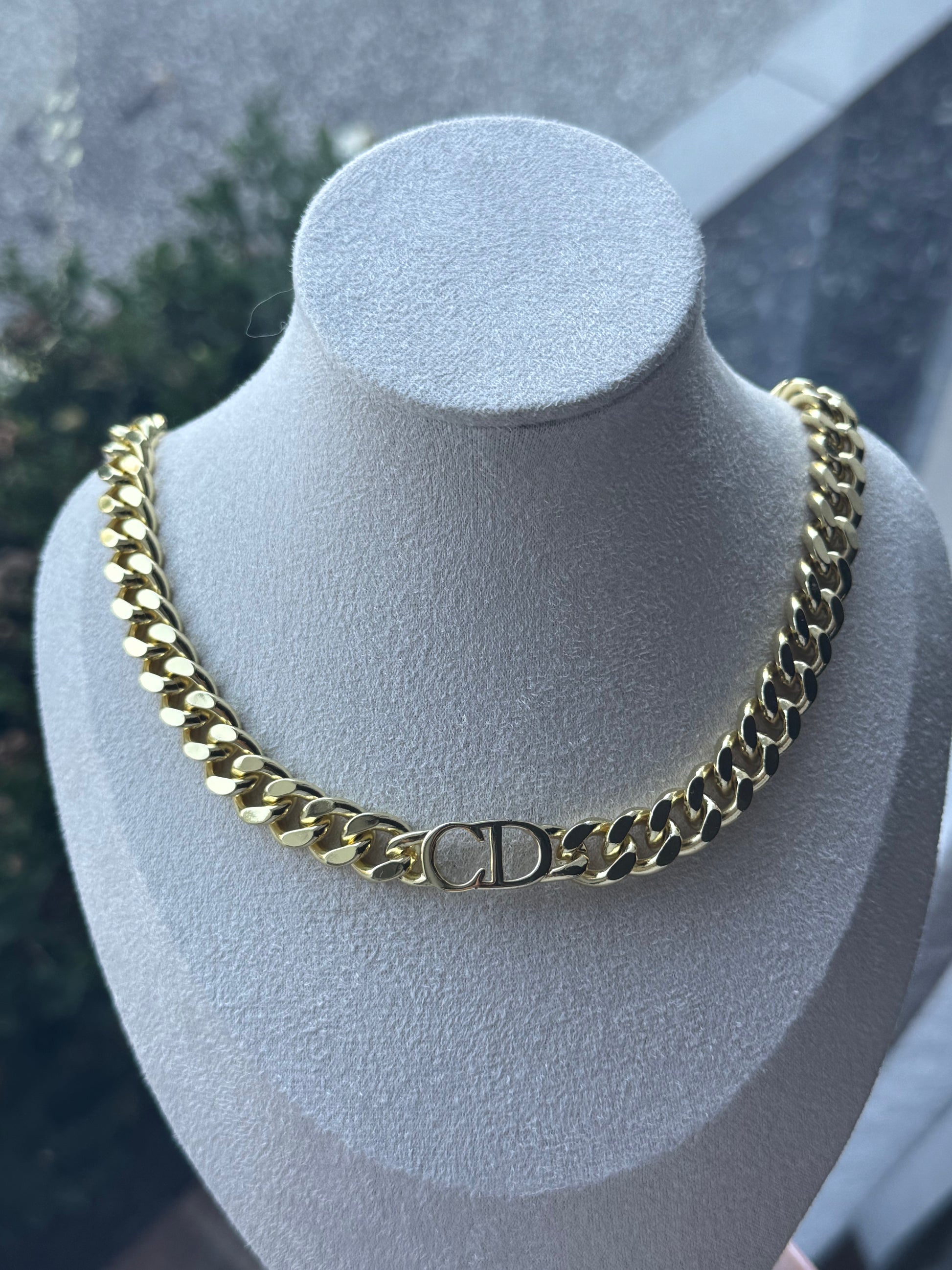 This CD chain necklace is a bold yet elegant statement piece, featuring a sleek chain design with signature letter details. Available in gold, it adds a touch of luxury to any outfit, perfect for layering or wearing alone. A must-have for those who love timeless, sophisticated accessories.